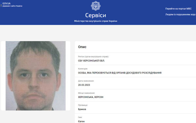 Херсонського колабораціоніста Євгена Брикова внесли у розшукову базу Міністерства внутрішніх справ України.Про це свідчать запис у відповідному реєстрі та інформація з сайту МВС України.Бриков потрапив у реєстр в якості особи, яка переховується від органів влади. Початком його переховування вважається 20 березня.А у розшукову базу Міністерства внутрішніх справ Євген Бриков потрапив 1 липня.