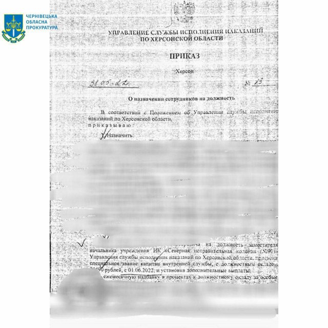 Чернівецька обласна прокуратура передала до суду обвинувальний акт стосовно колишнього старшого інспектора відділу нагляду і безпеки ДУ «Північна виправна колонія (№ 90)» за фактами державної зради та колабораційної діяльності (ч. 2 ст. 111, ч. 7 ст. 111-1 КК України).Як повідомляє Чернівецька обласна прокуратура, за даними слідства, працівник виправної колонії після захоплення Херсона перейшов на бік ворога.
