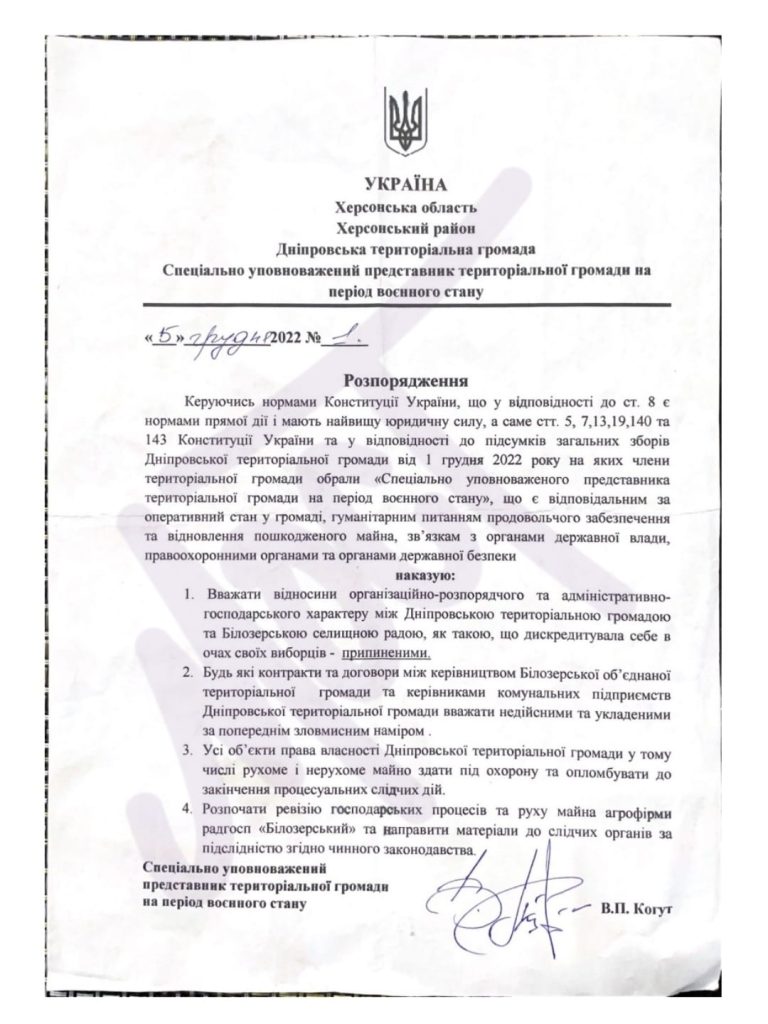 15 грудня 2022 року громадянин Василь Когут видав документ, який назвав розпорядженням спеціально уповноваженого представника територіальної громади на період воєнного стану. В ньому він написав, що 1 грудня пройшли загальні збори Дніпровської територіальної громади, на яких його і обрали «уповноваженим».