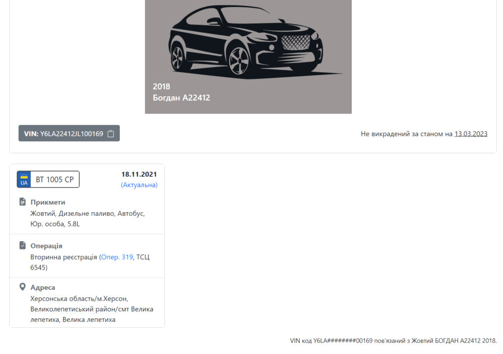Інформація про цей автобус є у відкритих джерелах: OpenDataUA та деяких інших. Тому шляхом нескладної перевірки можна з’ясувати, що цей автобус 2018 року випуску зареєстрований 18 листопада 2021 року в селищі Велика Лепетиха.