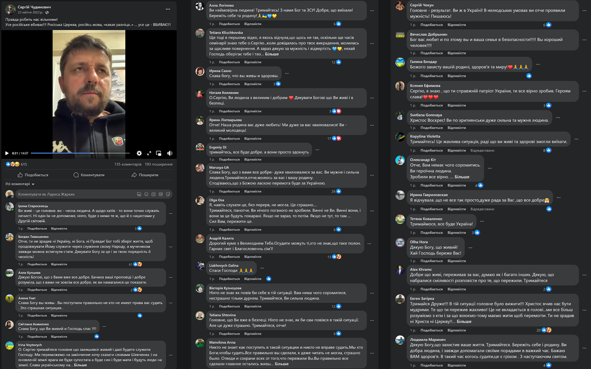 Отець Сергій був, мабуть, першим наважився розповісти свою історію – про нелюдські знущання, катування, погрозу зґвалтування. Він оприлюднив у фейсбуці своє звернення ще у квітні 2022 року, коли йому вдалося вибратися з окупованого Херсона. Ділився пережитим він і з журналістами Медіаплатформи «Вгору».