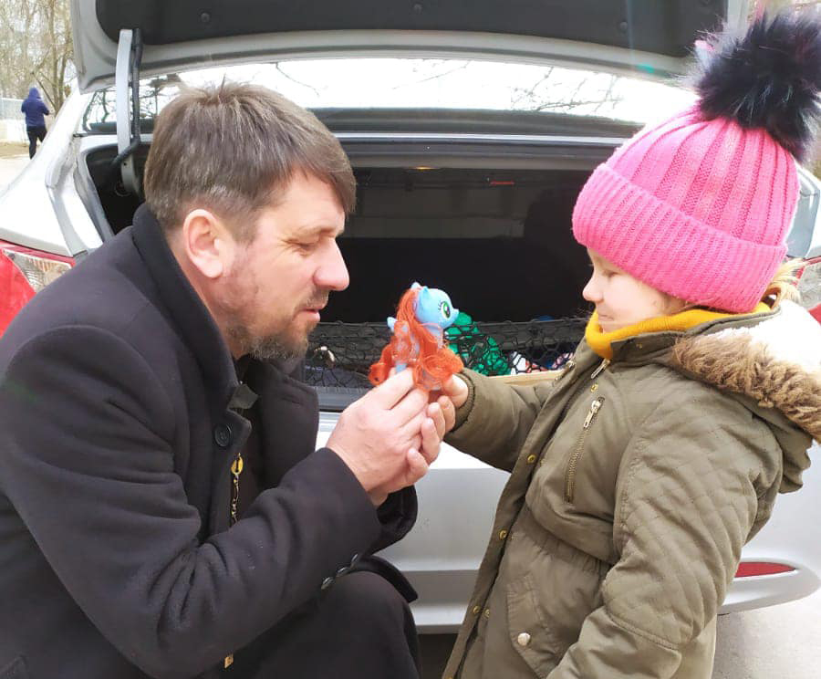 Отець Сергій розповідає, як запровадив рубрику «Рожевий поні», що в його машині був повний багажник іграшок: «Ми відвідували дітей. Підходиш, молитву прочитав, дав їй іграшку, кілька слів підтримки». Фото: Фейсбук Сергія Чудиновича, 18 березня 2022 року