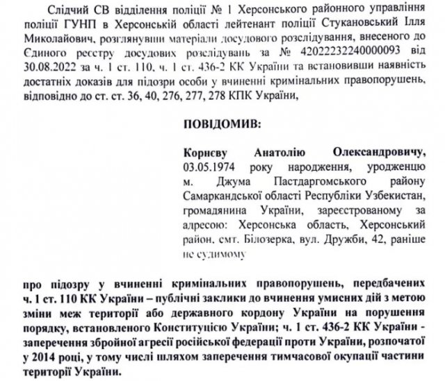 Слідчі Нацполіції встановили, що у вересні 2022 року в місцевому окупаційному пабліці Корнєв опублікував звернення, яке містить публічні заклики до незаконного змінення меж державного кордону України.