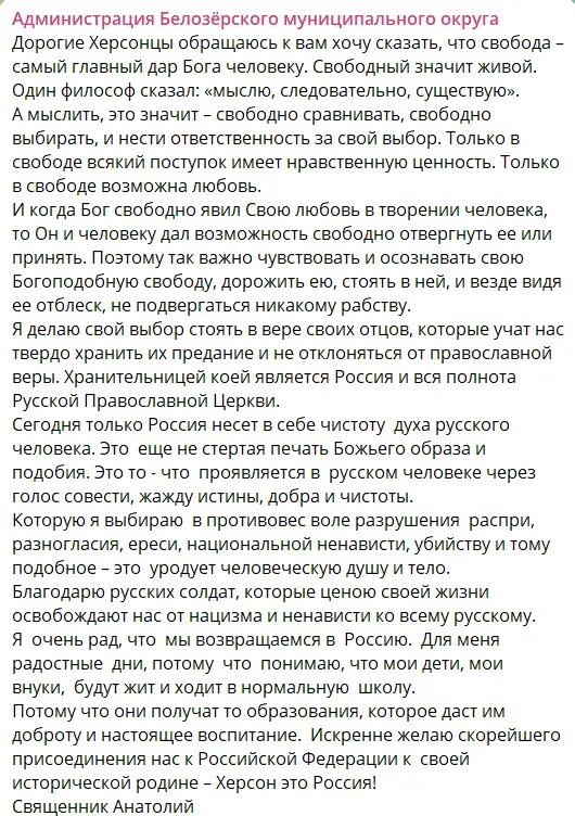 50-річний Анатолій Корнєв з селища Білозерка однойменної селищної громади Херсонського району Херсонської області отримав від Національної поліції України заочну підозру в посяганні на територіальну цілісність України і виправдовування збройної агресії Росії.Корнєв Анатолій Олександрович, 3 травня 1974 р. н., уродженець міста Джума в Узбекистані, мешканець Білозерки – настоятель храму Іоанна Кронштадтського Російської православної церкви (так званої УПЦ МП) в Білозерці.