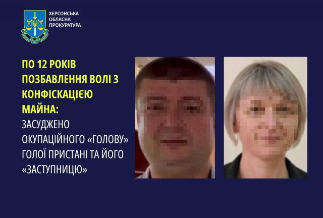 По 12 років позбавлення волі з конфіскацією майна: засуджено окупаційного «голову» Голої Пристані та його «заступницю»Про це повідомляє Херсонська обласна прокуратура.Мова йде про Геннадія Недялкова та заступницю Юлію Черемісіну відповідно.За публічного обвинувачення прокурорів Скадовської окружної прокуратури та Херсонської обласної прокуратури окупаційного голову Голої Пристані та його «заступницю» визнано винними у пособництві державі-агресору (ч.