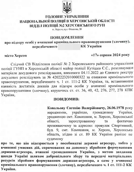 За це Євгенію Ковальову заочно загрожує від 10 до 12 років в’язниці (з додатковими обмеженнями та конфіскацією майна або без такої). Триває досудове розслідування.За інформацією обласної прокуратури, на Херсонщині за пособництво державі-агресору засудили вісьмох людей.