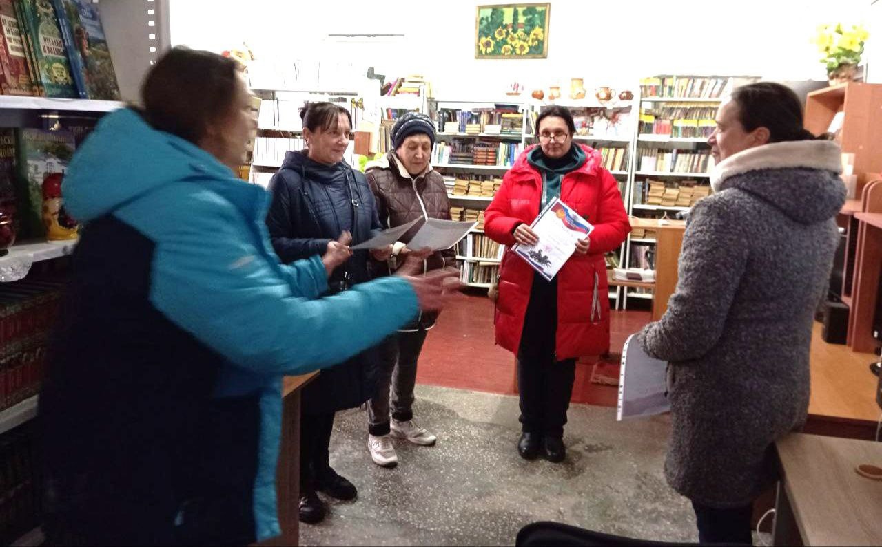 Колаборанти села Роздольне Наталія Міхальова (друга ліворуч), Надія Мархевка (третя), Світлана Хлистова (друга праворуч), Олена Горошко (крайня праворуч). Фото з окупаційного пабліка