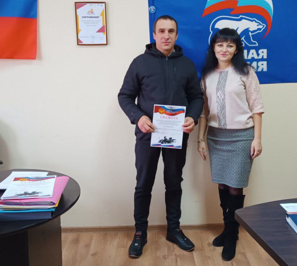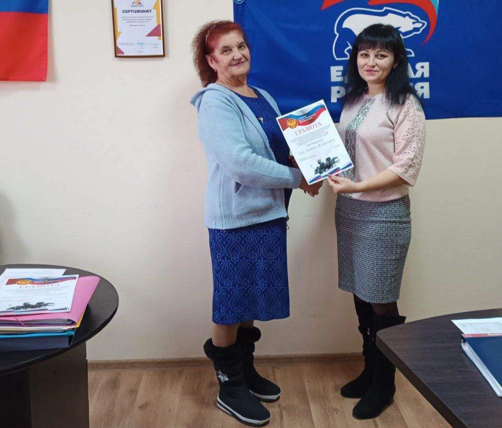 Отримала грамоту Сич Любов Олексіївна, пенсіонерка, голова громадської організації «Мир» мешканців житлового будинку №6 по вулиці 40 років перемоги села Коробки. Вона – біженка з російського міста Грозний, звідки свого часу тікала від російських бомбардувань.