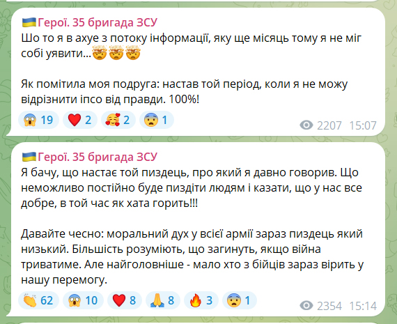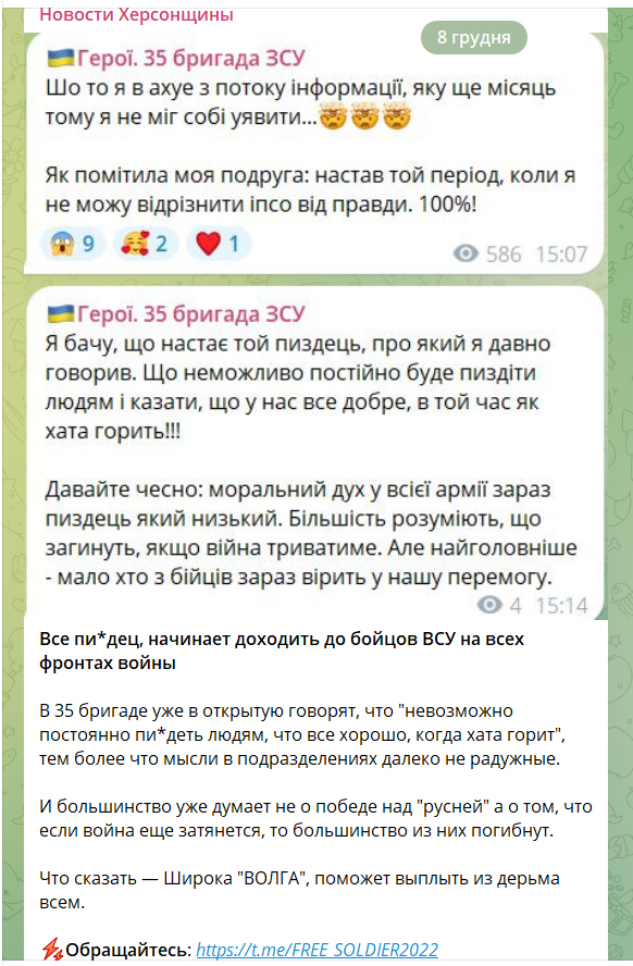 У 35-й бригаді вже відкрито кажуть, що «неможливо постійно пи***ти людям, що все добре, коли хата горить», тим більше що думки в підрозділах далеко не райдужні. І більшість уже думає не про перемогу над «руснею» а про те, що якщо війна ще затягнеться, то більшість із них загинуть. Що сказати – широка «Волга», допоможе виплисти з лайна всім.Пост з проросійського Telegram-каналу “Новости Херсонщины” і оригінальні пости з Telegram-каналу “Герої. 35 бригада ЗСУ”.