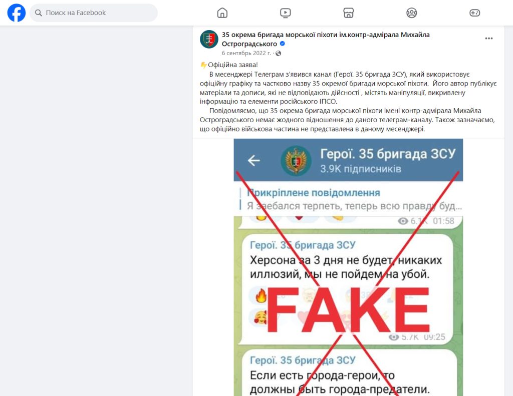 В месенджері Телеграм з’явився канал «Герої. 35 бригада ЗСУ», який використовує офіційну графіку та частково назву 35 окремої бригади морської піхоти. Його автор публікує матеріали та дописи, які не відповідають дійсності , містять маніпуляції, викривлену інформацію та елементи російського ІПСО. Повідомляємо, що 35 окрема бригада морської піхоти імені контр-адмірала Михайла Остроградського немає жодного відношення до даного телеграм-каналу. Також зазначаємо, що офіційно військова частина не представлена в даному месенджері, – йдеться в цьому повідомленні.