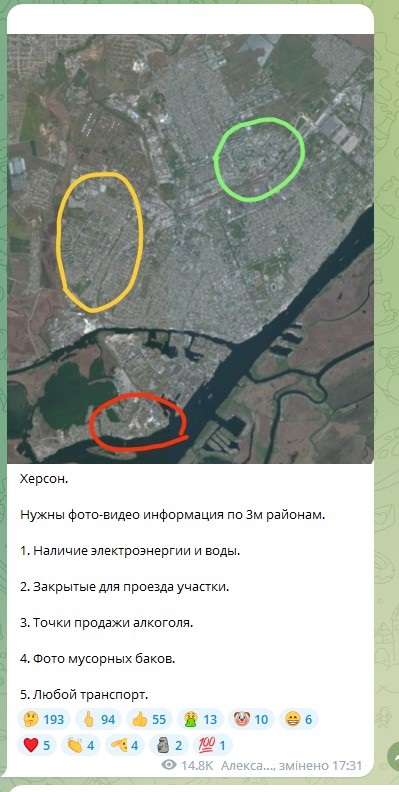 Окупаційні війська збирають інформацію для подальших обстрілів Херсона через підконтрольні Telegram-канали. Вчора про збір інформації оголосив один з таких. Зокрема, ворога наразі цікавлять місця закриті для проїзду транспорту, наявність електроенергії та води, точки продажу алкоголю, фото сміттєвих баків та інформація щодо транспорту, зокрема громадського. Запит інформації, щодо громадського транспорту свідчить про підготовку обстрілу маршруток, тролейбусів та зупинок або інших терактів із жертвами серед мирного населення міста.
