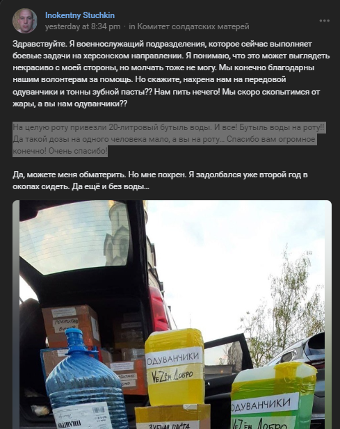 Спрагу відчувають і російські окупаційні сили, що розміщуються в області. Все частіше в соцмережах можна прочитати скарги окремих бойовиків про те, що підвезення води в рекордну спеку їм не можуть забезпечити ані місцеві колаборанти, ані волонтери з самої Росії. Так, нібито один з військовослужбовців коментує цю ситуацію в російській соцмережі “ВКонтакте”.