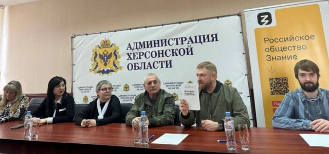 До речі, Олена Федосова і досі офіційно очолює генічеський ліцей (український заклад), хоча активно працює на окупантів і впроваджує російські стандарти освіти, зокрема входить до керівного складу російського товариства «Знание» (на фото — крайня ліворуч).