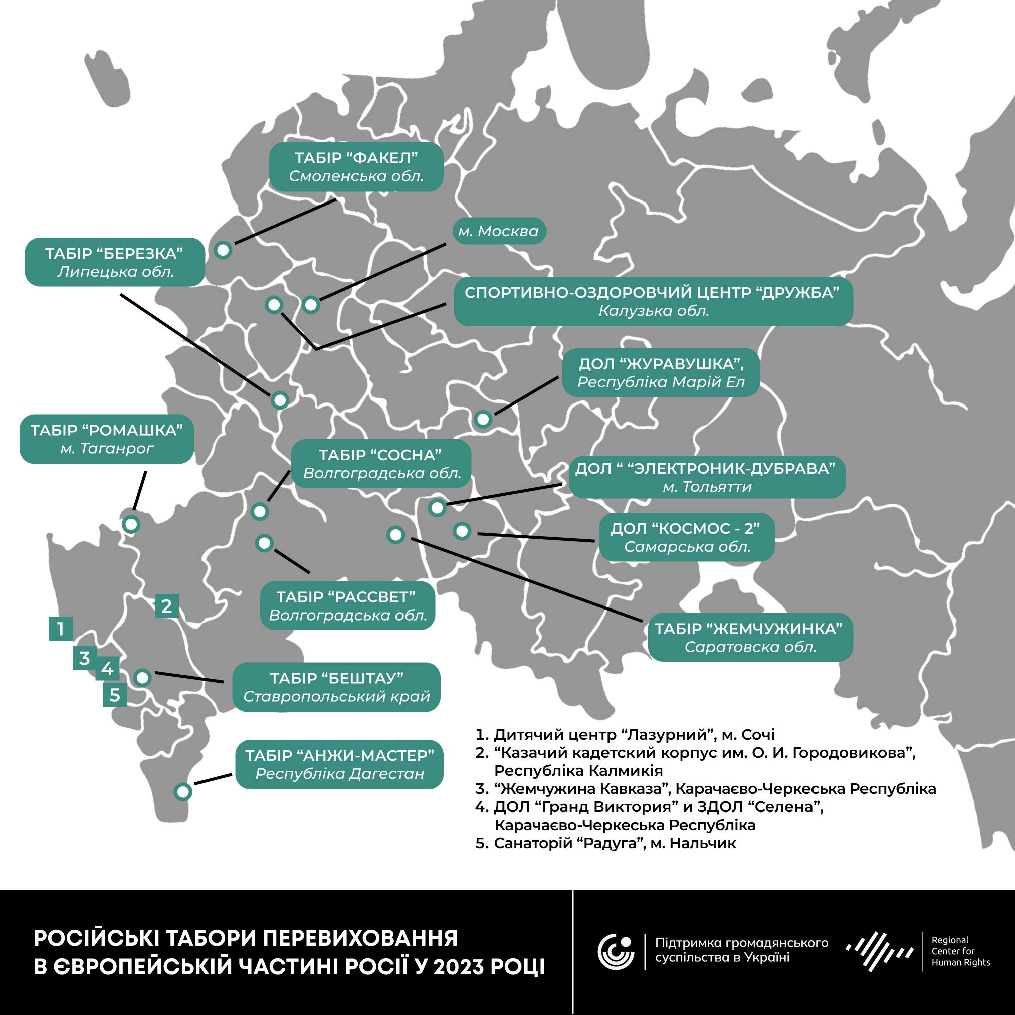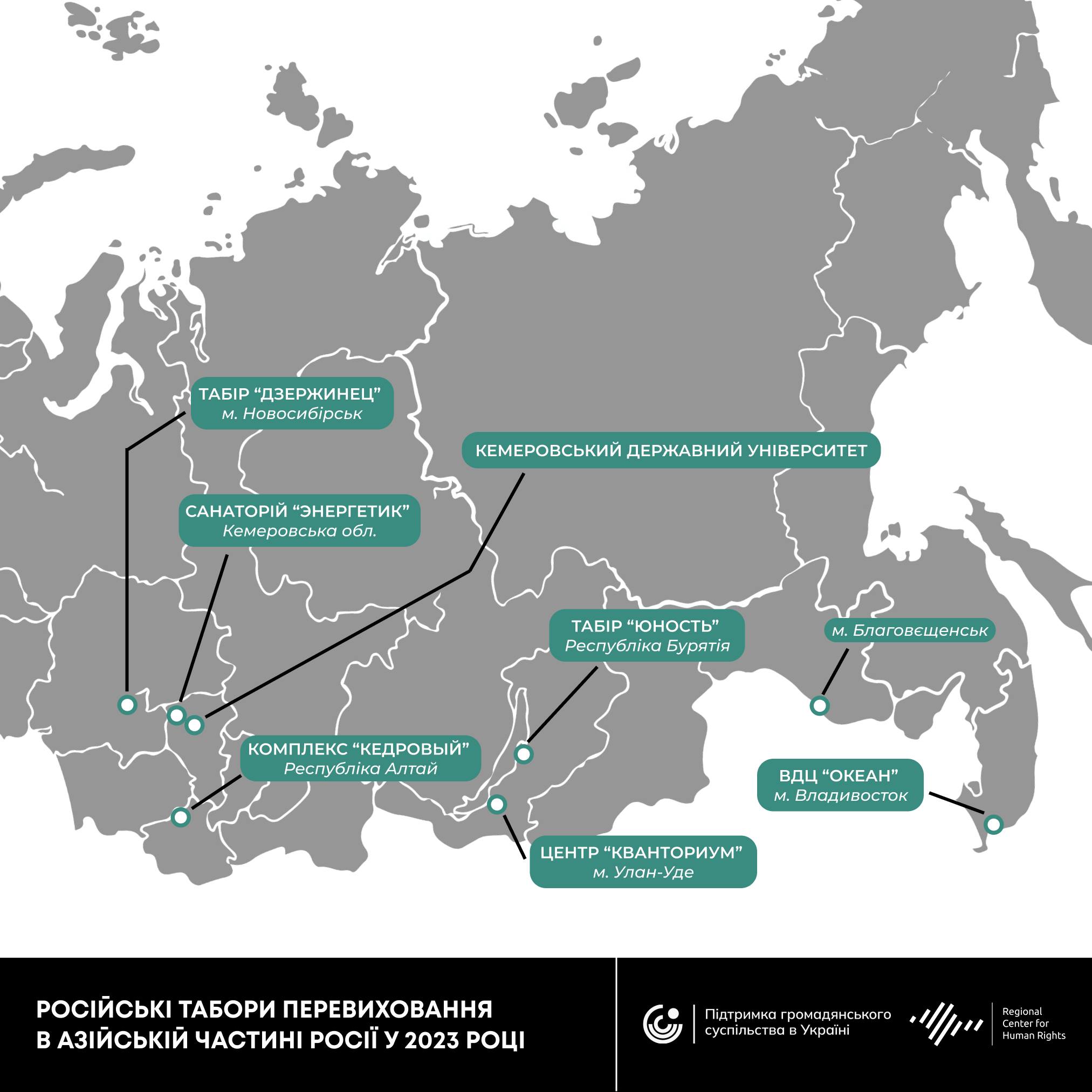 На сьогодні аналітики Центру виявили 13 таборів перевиховання на окупованій території України, ще 18 – у Білорусі та 67 – у Росії. Також, за їхніми даними, 2024 року витрати з федерального бюджету РФ на дитячий “відпочинок” зросли на 11,6% в порівнянні з минулим роком, досягнувши 76,8 мільярда рублів.