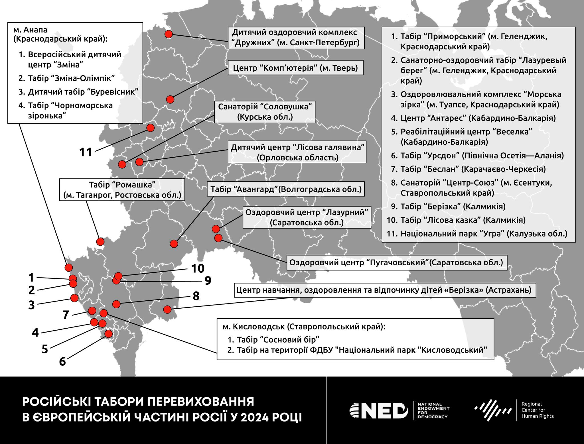 До того ж РЦПЛ з’ясував, що 2024 року Росія значно розширила мережу “таборів перевиховання” на нових окупованих територіях, відкривши в Бердянську (Запорізька область) філіал окупованого табору “Артек” під назвою “Червона гвоздика”. Також відчутно посилилася мілітаризація українських дітей у зв’язку з розгортанням діяльності Академії дружби народів “АХМАТ” та центру “Воїн”.Останній організовує зміну “Час героїв”, у процесі якої українських дітей навчають стріляти з автоматів, стрибати з парашутом, керувати дроном та мінувати територію.