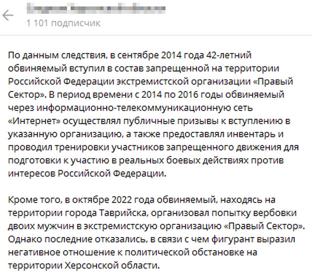 Російські окупанти збираються “судити” жителя Таврійська на Херсонщині.Про це у Telegram повідомило фейкове управління одного з російських правоохоронних органів у Херсонській області.Чоловіка звинуватили в участі у діяльності “екстремістської” організації, якою росіяни вважають “Правий Сектор”.Притому окупанти звинуватили людину і в діях, які вона могла здійснювати ще до потрапляння під їх фактичну владу.