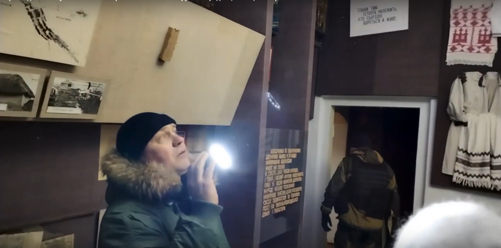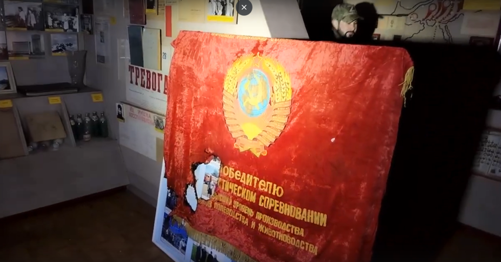 Найбільшу увагу в сюжеті окупанти приділили пошкодженому совєтському прапору «победителю социалистического соревнования», з чого зробили висновок про нібито знищення в Україні «спадщини минулого». Також окупаційна влада заявила про намір відновити роботу цього музею і використовувати його з суто пропагандистською метою.