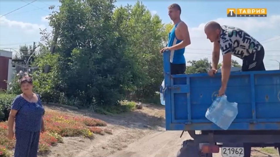 Окупанти роздають питну воду в Любимівці. Фото: скріншот відео окупаційного каналу «Таврия»