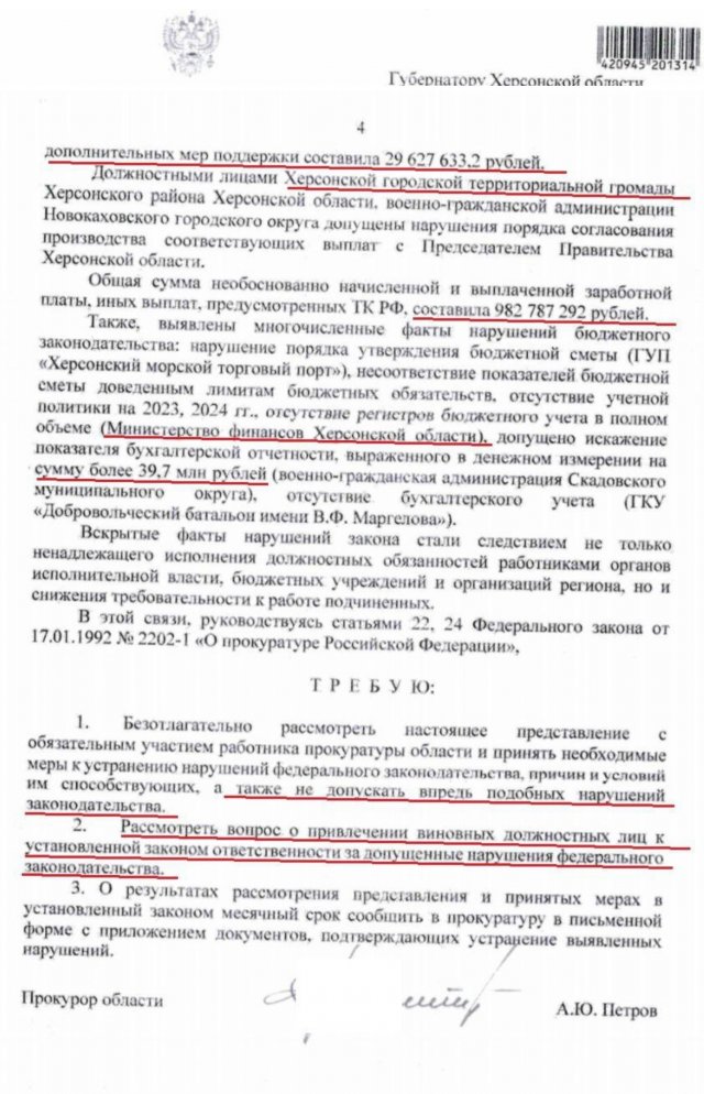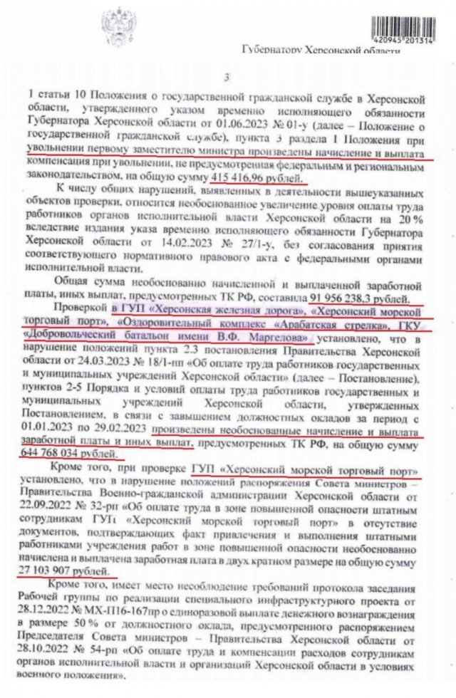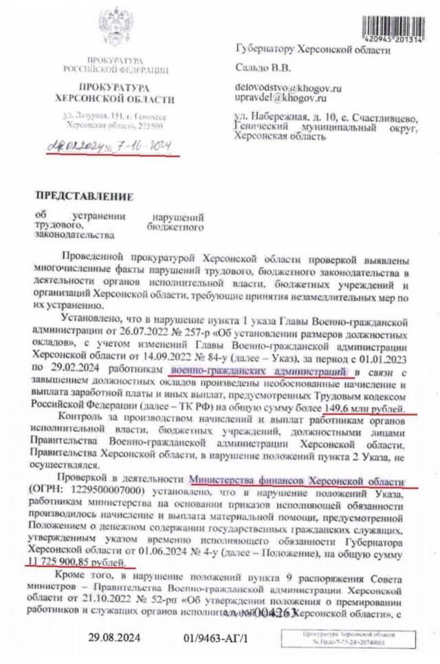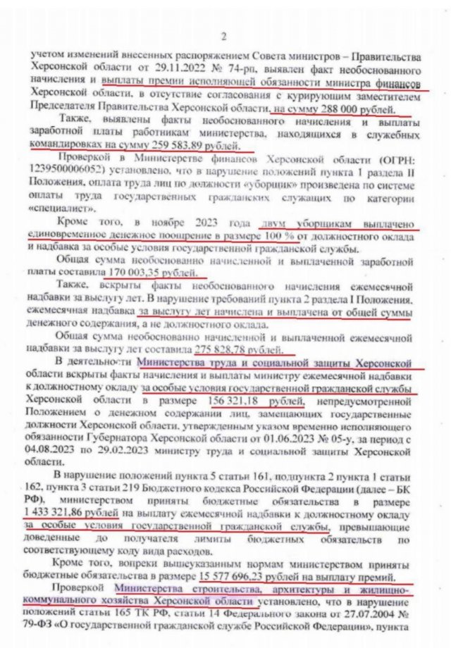 Документ з назвою «Подання про усунення порушень трудового, бюджетного законодавства» опубліковано на одному з окупаційних телеграм-каналів. У документі вказується, що проведеною перевіркою окупаційної прокуратурою області встановлено, що з 1 січня 2023 року по 29 лютого 2024 року працівники окупаційних військово-цивільних адміністрацій у зв’язку з завищенням посадових окладів необґрунтовано отримали 149,6 мільйонів рублів. Працівники окупаційного міністерства фінансів таким самим чином отримали на 11 725 900 рублів більше, ніж мали отримати. Виконуюча обов’язки міністра навиписувала собі незаконних премій на 288 000 рублів, її працівники за відрядження отримала на 259 583 рублів більше. В окупаційному міністерстві праці і соціального захисту вкрали з бюджету 156 321 рубль. В окупаційному міністерстві будівництва, архітектури і житлово-комунального господарства Херсонської області перший заступник «міністра» при звільненні незаконно отримав 415 416 рублів, а загальна сума незаконних виплат склала 91 956 238 рублів. В окупаційних «Херсонській залізниці», «Херсонському морському торговому порті», «Оздоровчому комплексі «Арабатська стрілка» та «Добровольчому батальйоні імені В.П. Маргелова», які невідомо чим займаються необґрунтовані виплати склали 644 768 043 рублів. Посадовці з окупаційної Херсонської міської територіальної громади, які невідомо де і знаходяться, незаконно збагатились на 982 787 292 рублі...
