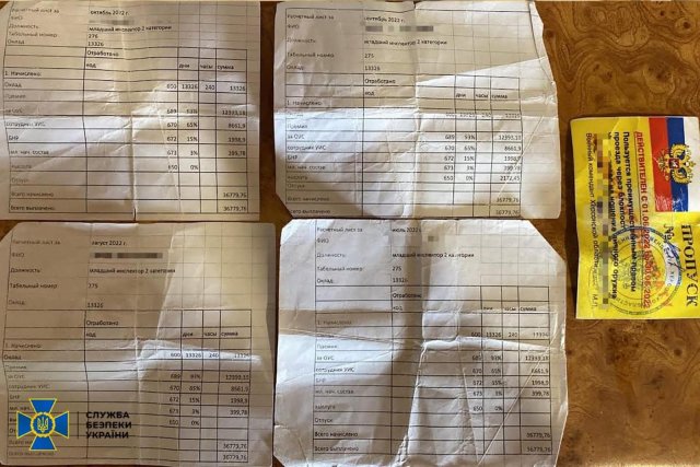 У ході обшуків за місцями проживання затриманих виявлено «посвідчення» окупаційного органу рф і фінансові «відомості» про отримання «зарплати» в російських рублях.