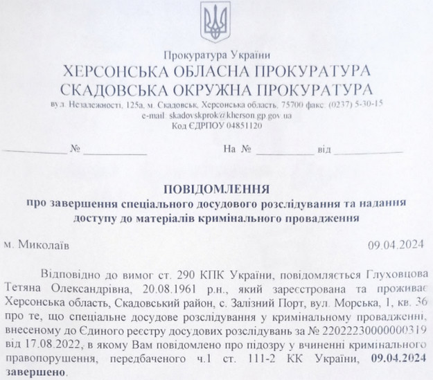 Служба безпеки України завершила розслідування проти незаконної колишньої директорки районної лікарні в Голій Пристані у Херсонській області Тетяни Глуховцової.Про це повідомляється на сайті Офісу Генерального прокурора.Глуховцовій інкримінували пособництво державі-агресору. За інформацією слідства, вона платила підлеглим зарплату в рублях, шукала і призначала на посади у лікарні нових людей.