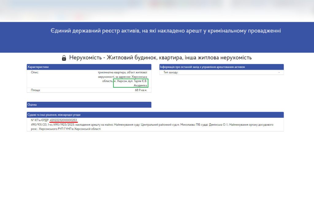 Центральний районний суд міста Миколаєва арештував квартиру директорки школи № 35 у Херсоні Наталії Юрченко.Про це свідчить інформація з Єдиного державного реєстру активів, на які накладено арешт у кримінальному провадженні.По кримінальному провадженню за номером з Реєстру проходить саме Юрченко.А арештована 3-кімнатна квартира знаходиться на вулиці Академіка Тарле, де зареєстрована Наталія Юрченко.