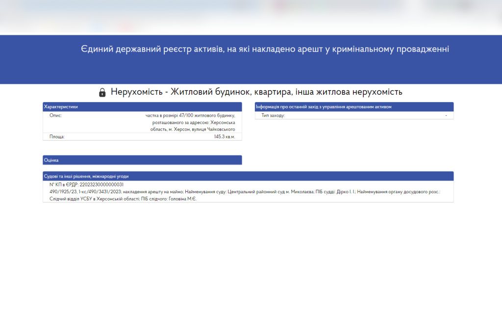 Про це свідчить інформація з Єдиного державного реєстру активів, на які накладено арешт у кримінальному провадженні.