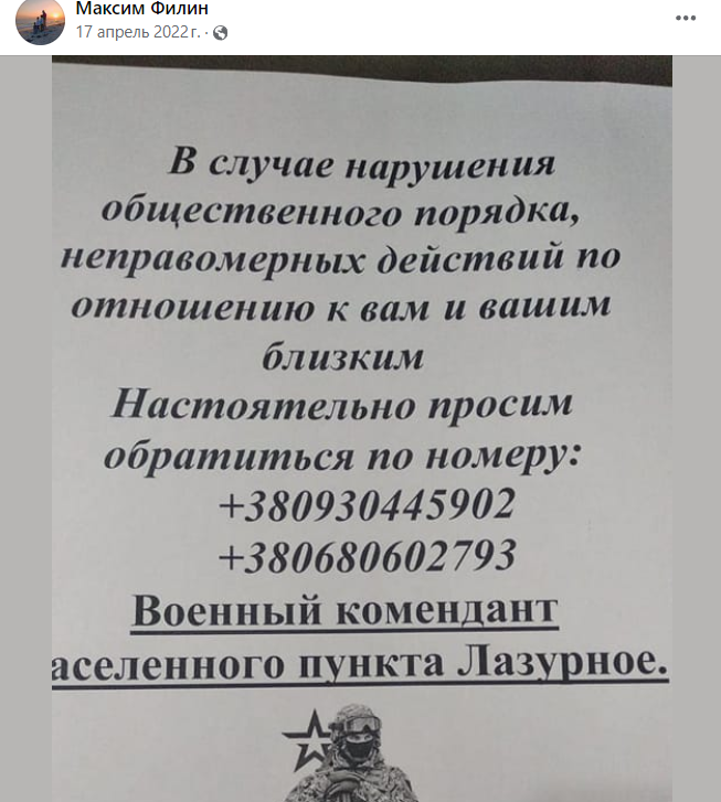 Використовуючи вказаний номер, Філін погодився привезти місцевого мешканця на допит, обговорював затримання російськими окупантами жінки, щоб її “перевиховати”, обставини затримання місцевого чоловіка дагестанцями, необхідність затримання в Скадовську чоловіка, який знає адміністраторів багатьох місцевих пабліків.