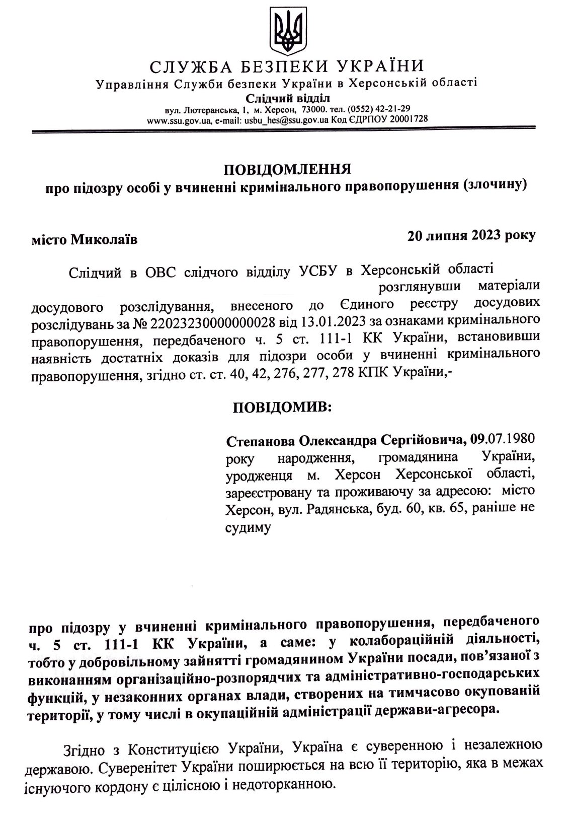 Ідеться про лікаря-фтизіатра з Херсона Олександра Степанова, 9 липня 1980 року народження. Йому було повідомлено про підозру в колабораціонізмі в липні минулого року.