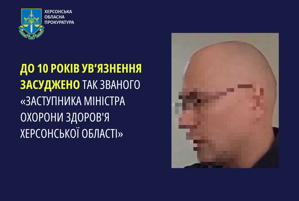 До 10 років ув’язнення заочно засуджено колишнього херсонського лікаря, який добровільно працював в окупаційних органах охорони здоров’я.У липні 2022 року під час окупації Херсона він обійняв посаду «начальника управління організації медичної допомоги, медицини катастроф, освіти та науки Департаменту охорони здоров'я Херсонської області» в окупаційній адміністрації області.Пізніше окупанти створили на базі фейкового «департаменту» ціле «міністерство охорони здоров'я Херсонської області», де фігурант став заступником міністра.