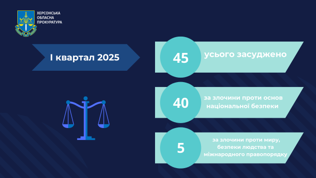 Органи прокуратури продовжують боротися за справедливість, забезпечуючи невідворотність покарання для осіб, які вчиняють злочини. Про це звітує пресслужба Херсонської обласної прокуратури.За участі прокурорів судами першої інстанції ухвалено обвинувальні вироки щодо 45 осіб. Із них: • 40 засуджені за кримінальні правопорушення проти основ національної безпеки;• 5 — за злочини проти миру, безпеки людства та міжнародного правопорядку.