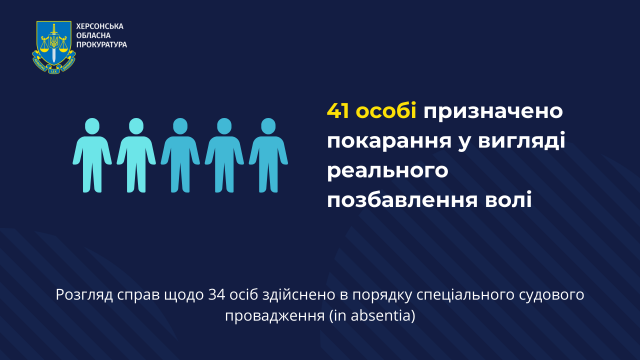 41 особі призначено покарання у вигляді реального позбавлення волі.Розгляд справ щодо 34 осіб здійснено в порядку спеціального судового провадження (in absentia) відповідно до ч. 3 ст. 323 КПК України. Ще 7 обвинувачених перебувають під вартою.