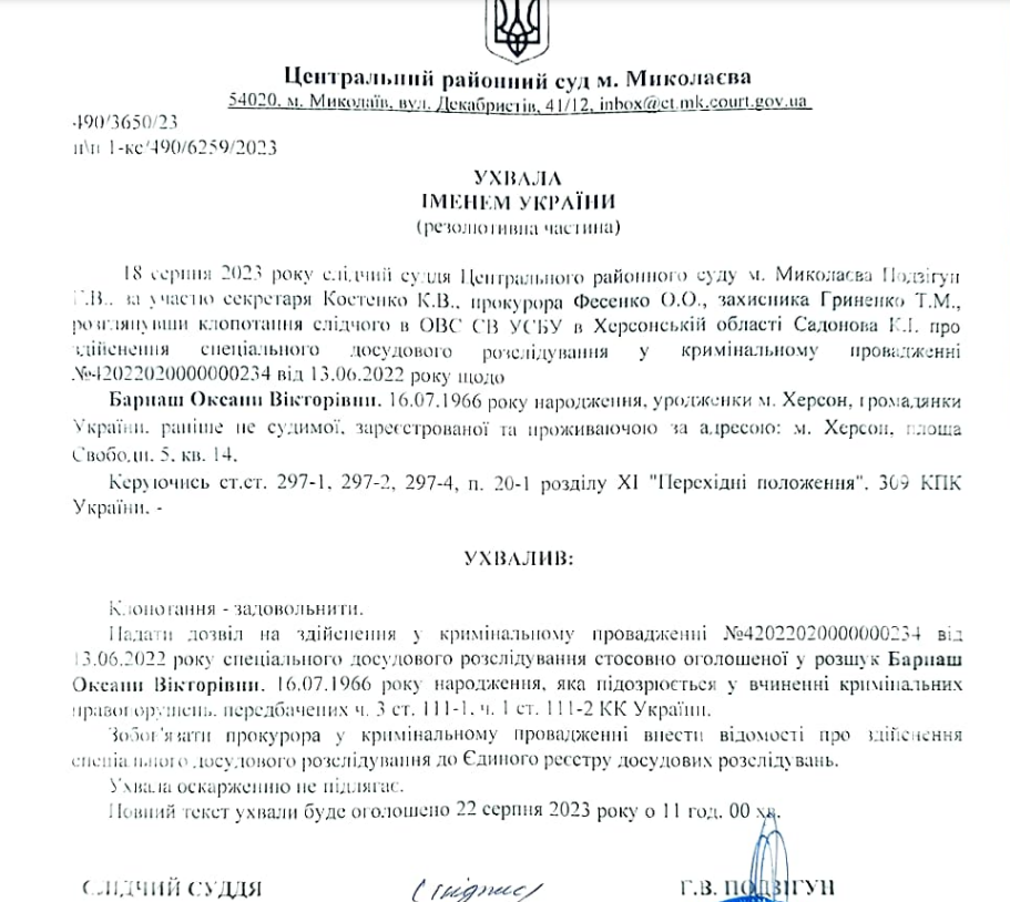 Центральний районний суд Миколаєва ухвалив проведення спеціального розслідування у справі про державну зраду екс-директорки херсонської школи Оксани Барнаш. Про це можна дізнатись на сайті Офісу Генпрокурора України.За клопотанням слідчого СБУ суд у Миколаєві надав дозвіл на проведення спеціального досудового розслідування у справі Оксани Барнаш. За інформацією з різних джерел, Барнаш наразі перебуває поза межами України — саме тому і проводиться спеціальне досудове розслідування (in absentia).