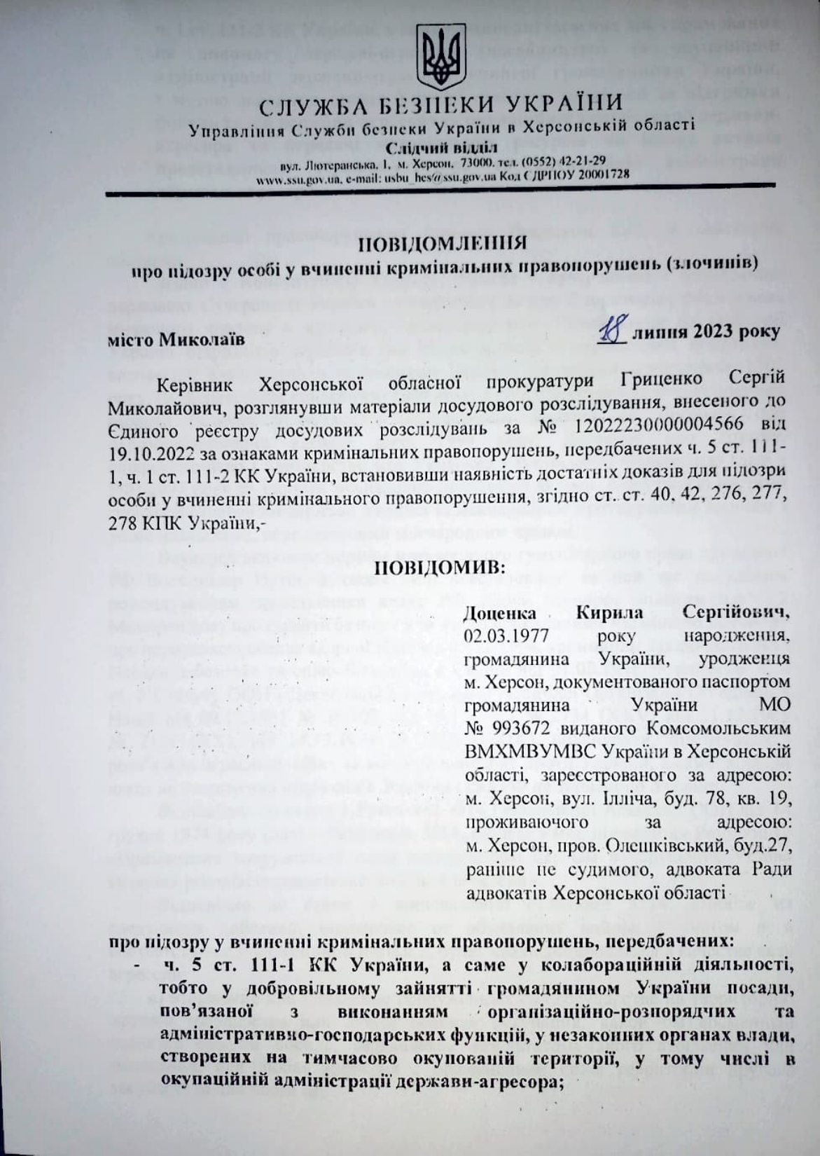 Служба безпеки України повідомила про підозру херсонському адвокату Ради адвокатів Херсонської області Кирилу Доценку. Текст документу оприлюднено на сайті Офісу Генерального прокурора.Кирила Доценка, 2 березня 1977 року народження, звинувачують у колабораціонізмі та пособництві державі-агресору – за ч. 5 ст. 111-1 та ч. 1 ст. 111-2 КК України.У документі зазначено, що херсонець пішов на співпрацю з росіянами не пізніше 18 липня минулого року.