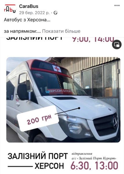 Фото: facebook.com/carabuskhersonРозумієте, ми жили так, що в нас була наша українська влада, наш мер. Лютий, березень, квітень… По-моєму, до травня [2022-го] у нас був діючий мер. Його не чіпали росіяни. У нас над міською радою висів український прапор. Ми разом із ним (з Колихаєвим — ред.) запустили місто, показали, що боятися нічого не треба, треба їхати і працювати.Ми обслуговували Залізний порт, Ковтуни… Майже [всю] Херсонську область. Після окупації склалась дуже серйозна ситуація з медикаментами, із продуктами харчування. Люди помирали пачками. Мені подзвонив голова територіальної громади і попросив привезти ліки. Ми запустили маршрут «Залізний порт». Це були суто гуманітарні поїздки, я віз ліки, інсуліни, медрозчини в лікарні. Поступово ми запустили ті села… Це також на прохання місцевих, бо ситуація була критична.