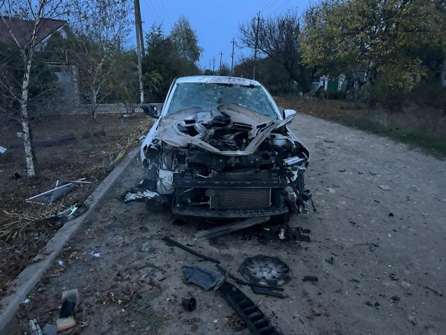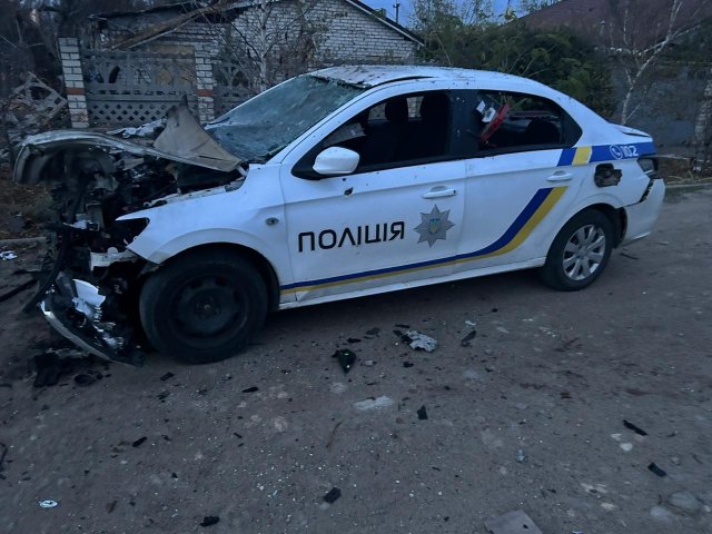 У Бериславі ворог скинув з БпЛА боєприпас, травми отримали 43-річний поліцейський і 47-річний місцевий житель. Із численними пораненнями їх доправили до лікарні. Також вибухом значно пошкоджено службовий автомобіль.