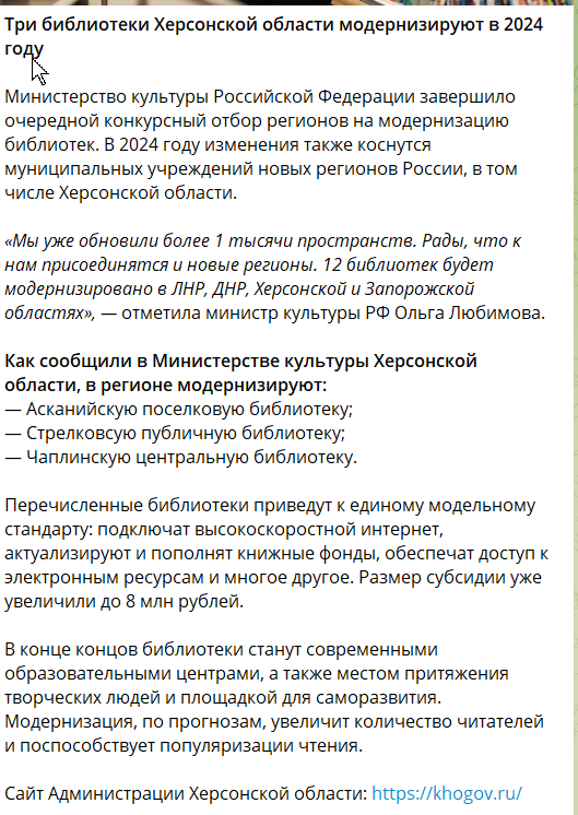 У вересні на тимчасово окуповану частину Херсонської області рашисти завезли чималу партію пропагандистських книжок. Понад 4 тисячі примірників проросійської літератури з Рязанської області окупанти збиралися розподілити між бібліотеками у захоплених населених пунктах. Натомість українську літературу ворог вилучає з фондів та знищує. На черзі у окупантів – «модернізація» бібліотек.Як пишуть пропагандистські пабліки, так зване «Міністерство культури Херсонської області» повідомляє, що у регіоні «модернізують» три бібліотеки: Асканійську, Стрілковську та Чаплинську.