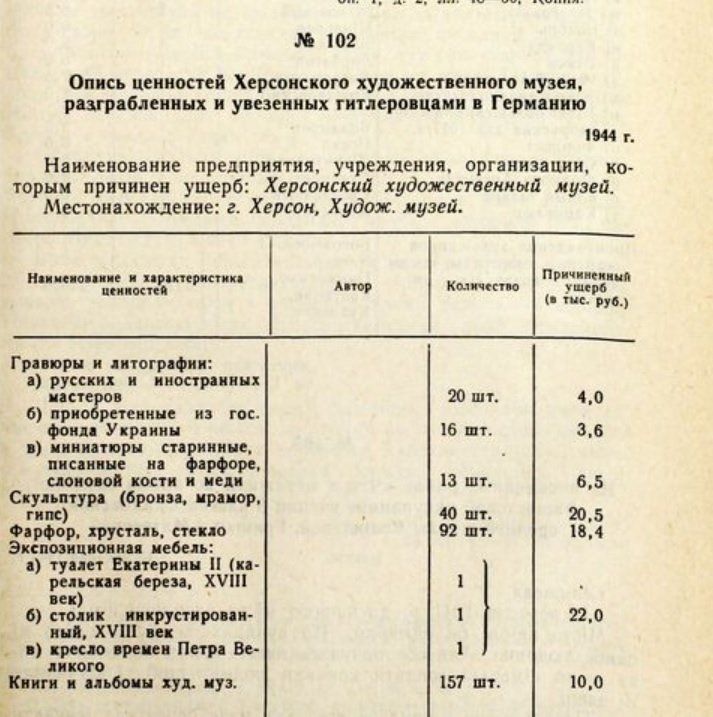 Херсон нацистські війська також пограбували. Вивезли, наприклад, з фондів місцевого музею більшу частину колекції, у тому числі твори мистецтва. До війни тут зберігалося близько 700 експонатів. Лише у 1944 році почалися пошуки втрачених цінностей.