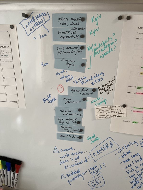 Те, як це виглядає у книжці, майже повторює те, що сталося насправді. Спочатку я писала сатиричний роман, щось у жанрі комедії. Працювала над ним із 2018 року. Але після початку повномасштабного вторгнення Росії я не знала, як продовжувати. Здавалося: або ігнорувати все, що відбувається, або відмовитися від книжки. Звісно, я не могла ігнорувати війну. Це було єдине, про що я думала. Тому відклала рукопис.Але згодом зрозуміла: єдиний спосіб повернутися до роботи — вплести в книжку всі свої запитання. Яка роль письменника зараз? Яка моя особиста роль як людини, що спостерігає за війною здалеку, але має рідних в Україні?