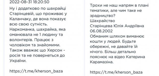 – Я написала цьому водієві: "Слава Україні! Всіх знайдемо". А він мені побажав здохнути, а також висловив надію, що мені на голову прилетить російська ракета. Виявилося, що ця їхня діяльність з виманювання грошей – пропрацьована схема. Про них навіть писав один із Telegram-каналів Херсонщини. Я вже потім про це дізналася. Там попереджали, що ця жінка – наркоманка, займається шахрайством у компанії свого чоловіка та знайомого. Публічно стверджує, що Херсон – це російська територія".