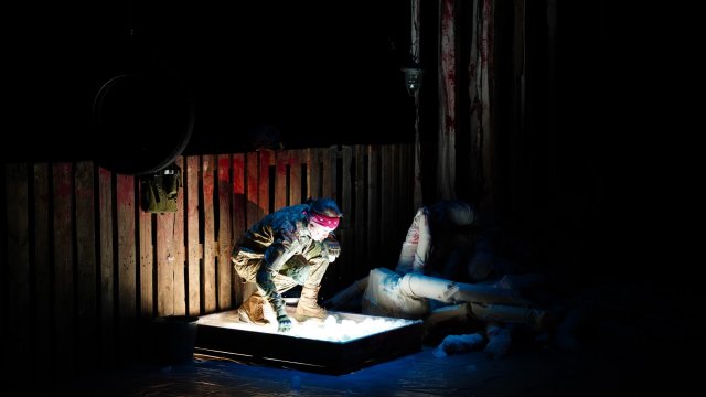 “Це історія журналістки, яка їде з військовим на Донбас. Вона закохалася в цього військового, який її супроводжував. Це період Донецького аеропорту, якраз ці події. У виставі режисер Сергій Павлюк зробив так, що вона згадує цю історію, розповідає її… тоді вона була журналісткою, а зараз військова. Вона після вибуху. Поранена жінка, якій приходять ці спогади, і вона в кінці помирає”, — розповідає художній керівник Херсонського академічного театру
