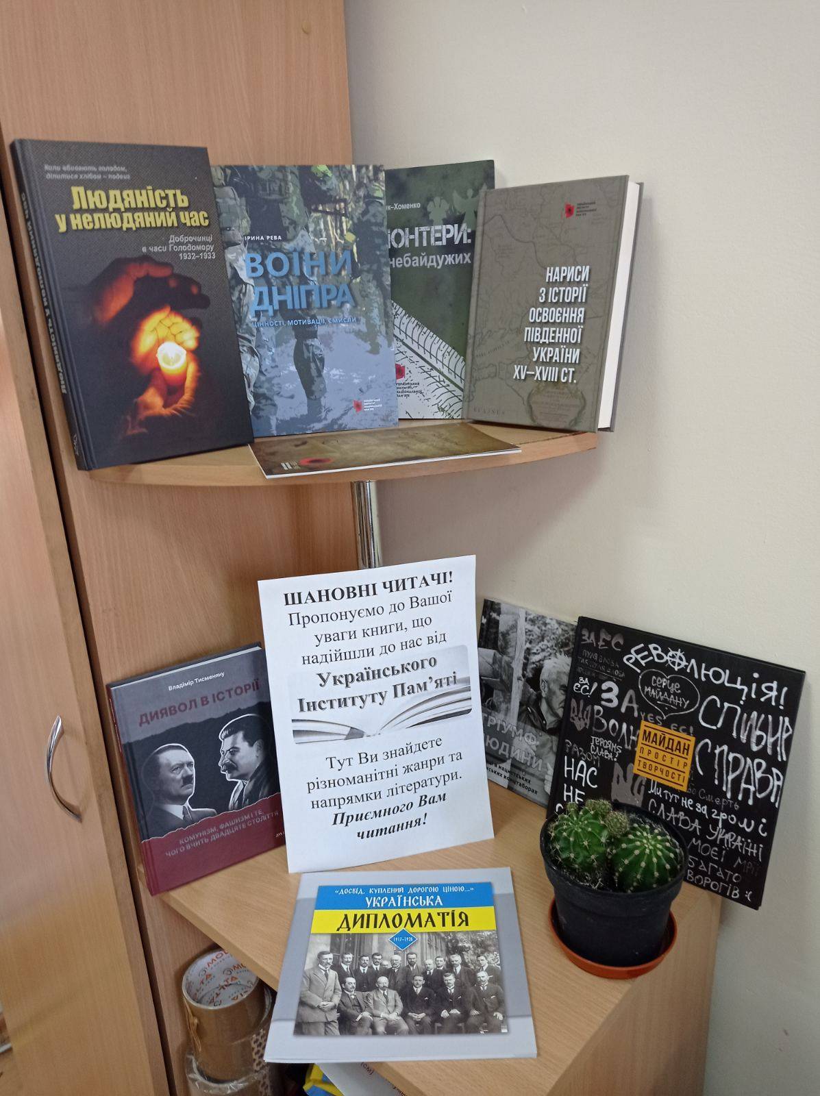 Український інститут національної пам'яті передав Херсону книжки, присвячені історії України.На окремій поличці – історичні книги. Фото зі сторінки Центральної бібліотечної системи в соцмережі