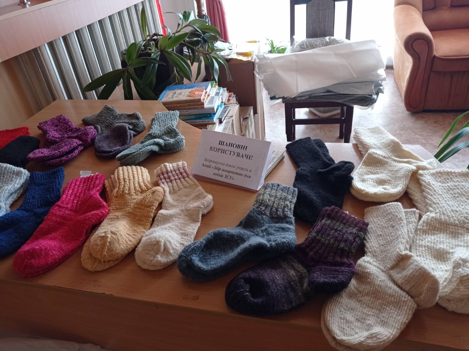 У межах акції «Шкарпетки для захисників ЗСУ» в херсонських бібліотеках збирають шкарпетки. Як тільки назбирується певна кількість, теплі посилки пересилають до військових підрозділів. Наразі, за підрахунками, подарунки отримали декілька військових частин.Збір шкарпеток для воїнів ЗСУ триває. Фото зі сторінки Центральної бібліотечної системи в соцмережі