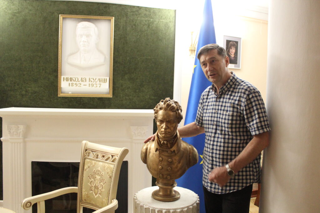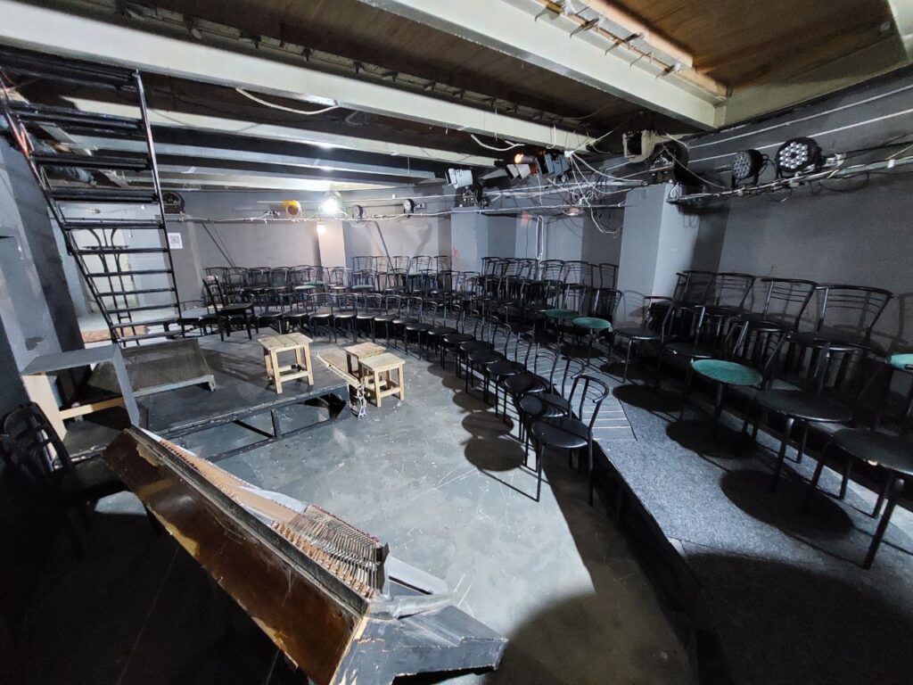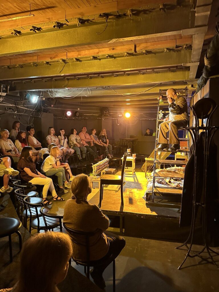 одна з маленьких сцен, де грають вистави“Я одразу оголосив збори колективу, тих, хто в місті. І одразу почали думати як ми можемо відновлювати роботу. Бо окупанти викрали з театру всі інструменти, навіть молотка не було. Костюми теж з собою забрали. Колектив розпорошений по Україні та світу. Перший місяць ми працювали, фактично, як гуманітарний штаб. Але паралельно думали і над творчістю. Я сказав нашому диригенту Артему Філенку, який всю окупацію лишався в місті, збирати музикантів. І отак Артем дуже швидко зібрав музикантів, які в місті були і були без роботи. Хтось в музичній школі працював, хтось ще десь. Люди прийшли і І ми одразу почали музичні програми створювати”. – розповідає директор театру.
