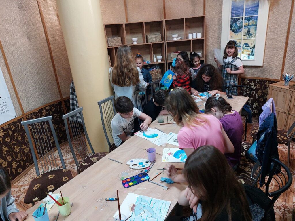 директор і художній керівник херсонського драмтеатру Олександр КнигаНа подвір’ї вантажаться декорації для чергової прем’єри, на репетицію збираються музиканти, Тим часом в арт-хабі в укритті теж велелюдно: тут дорослі плетуть вироби з бісеру, а тут вже діти малюють веселих китів. Трохи згодом дорослі збираються на заняття з англійської та української.