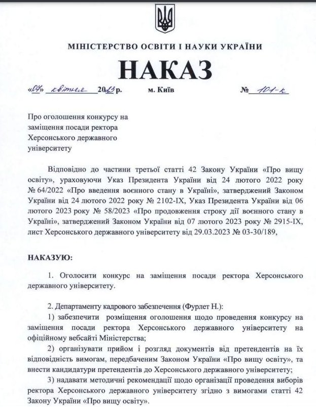 Ректор Херсонського державного університету Олександр Співаковський опублікував наказ МОН України “Про оголошення конкурсу на заміщення посади ректора Херсонського державного університету”.Відповідно до наказу у виші пройдуть вибори ректора 23 червня 2023 року. Підписав наказ Міністр Оксен Лісовий. Український південь