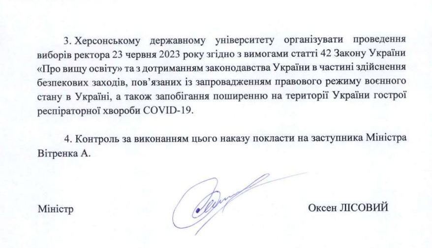 Відповідно до наказу у виші пройдуть вибори ректора 23 червня 2023 року. Підписав наказ Міністр Оксен Лісовий.