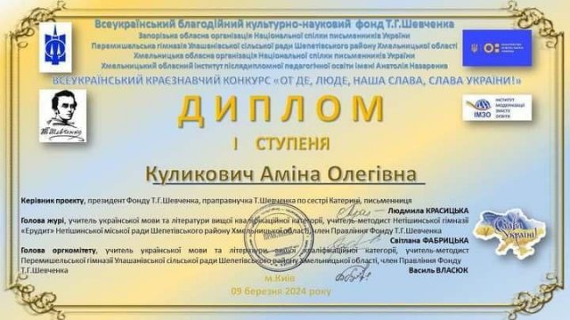 Учениця Херсонської спеціалізованої школи I-III ступенів №52 з поглибленим вивченням української мови Аліна Куликович перемогла у Всеукраїнському краєзнавчому конкурсі "От де, люде, наша слава, слава України!", присвяченому 210-й річниці з дня народження Тараса Шевченка.Про це повідомив начальник Херсонської МВА Роман Мрочко.Зазначається, що конкурс започаткував Всеукраїнський благодійний фонд Тараса Григоровича Шевченка.