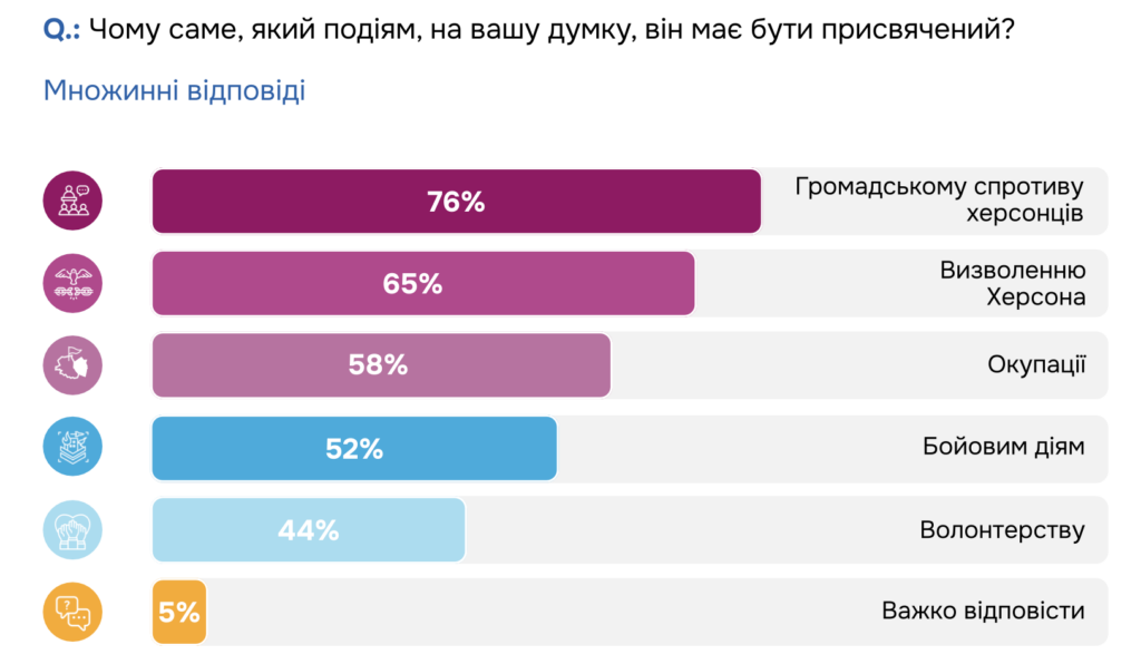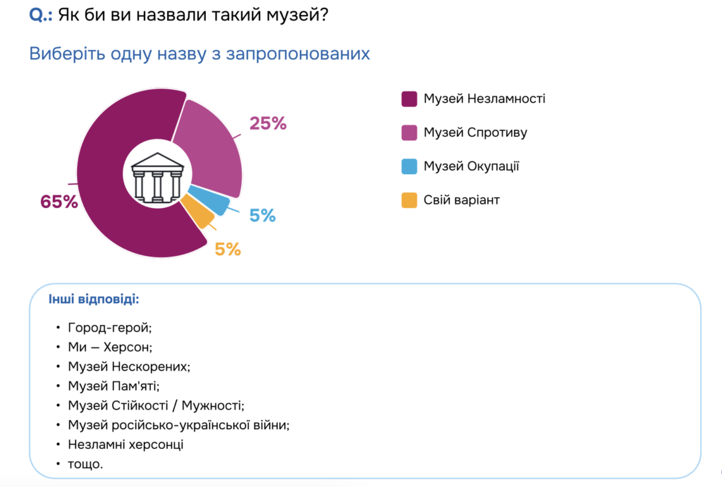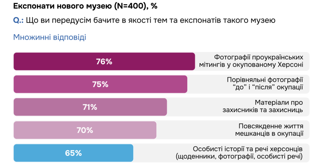 Більшість херсонців виявилися прихильниками створення такого музею у приміщенні (62%), але п’ята частина (19%) опитаних висловилася в підтримку створення музею під відкритим небом. Судячи з наступного запитання, це мав би бути Бузковий гай – місце бою Херсонської тероборони із загарбниками. Розташований музей має бути у центрі міста – це думка 55% опитаних. 26% – бачать його на Набережній, а 13% – в одному з мікрорайонів.Херсонські акції протесту в 2022 році, на думку херсонців, це найважливіша подія періоду окупації – 76% опитаних бачать матеріали з проукраїнських мітингів у якості експонатів нового музею.