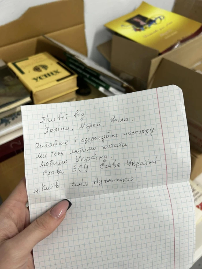 Записка від небайдужих, які надіслали книги. Фото з фейсбук-сторінки ГО «Сяйво безмежної мрії»